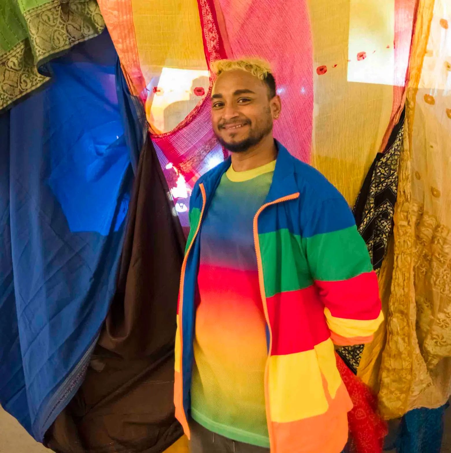 My work is rooted in my ingrained Indian heritage, the conviviality of the brothel I grew up in and further branches out to the rooftops of the diasporic queer community that I now call home. Curious in self-portraiture and mythology, I distort and reconstruct traditional narratives of body, gender, and sexuality in an attempt to understand myself as a visual subject. The sari has become a leitmotif in my recent works: tied to the memory of the violent death of my mother burnt in fire, the saris bear the weight of her absence and erasure. Yet their literal veiling also forms a womb-like shelter, allowing for play with gender. The fabrics are both brushstrokes of colors and feminine exuberance even as they record loss.
